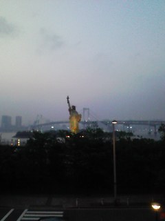 自由の女神の背後には、レインボーブリッジ。